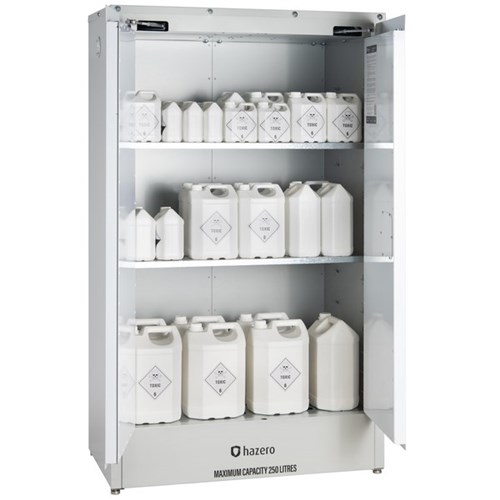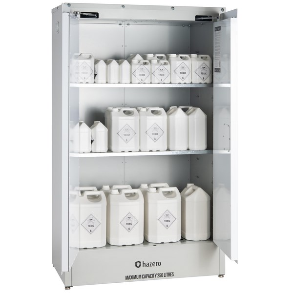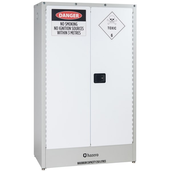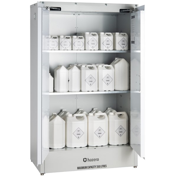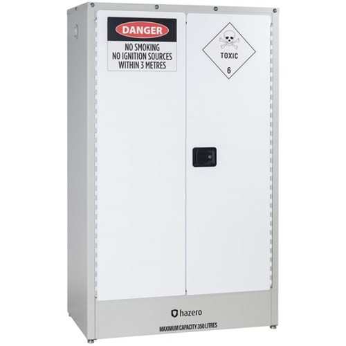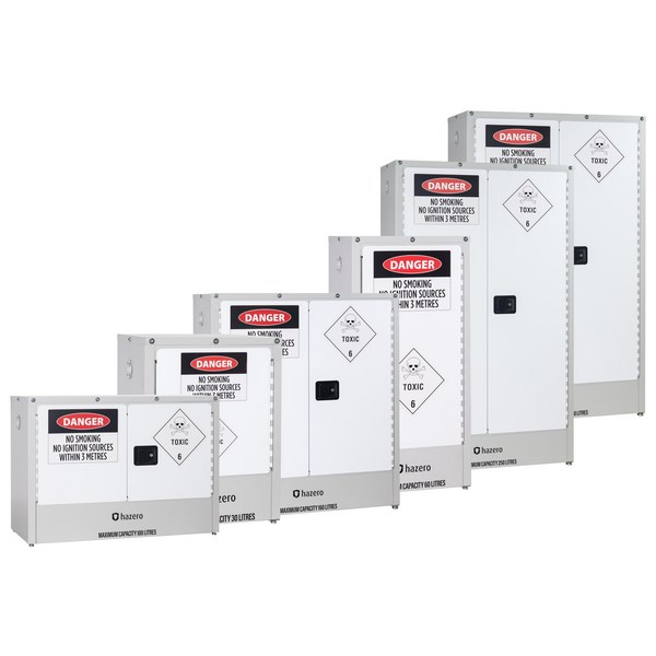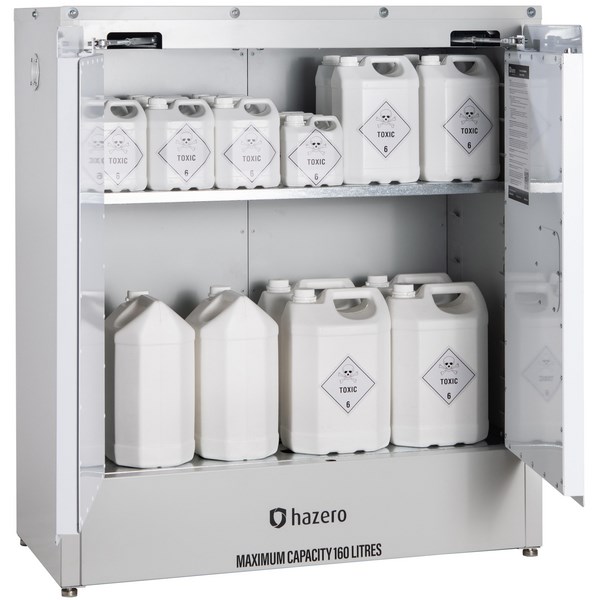 The Hazero Toxic Substance Storage Cabinet is designed to securely store Class 6 toxic and infectious substances, ensuring the safety of individuals. It is recommended to place these compact cabinets near handwashing facilities to promote safe work-hygiene practices. The cabinet features a lockable, self-closing door, an adjustable perforated shelf, and a base for efficient storage.