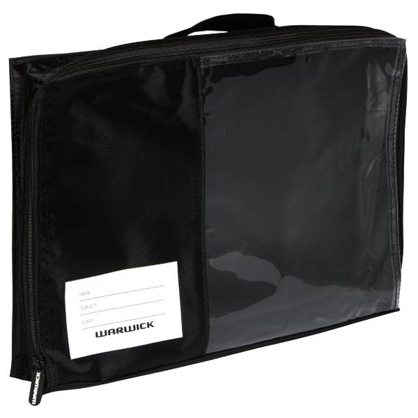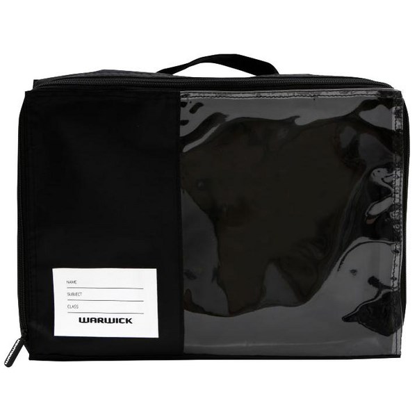 Use this Warwick Black Book Bag to protect your books. It is a zip up bag with a clear panel in the front for easy viewing. It makes carrying multiple books easy while ensuring they are protected and not easily dropped. Complete with a name panel for easy identification. Measures 370x265x85mm (wxlxd).