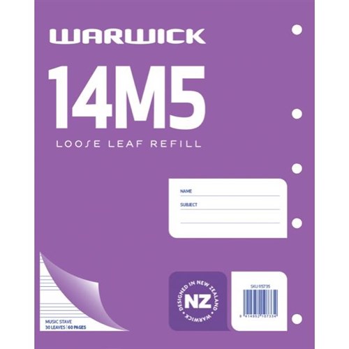 This Warwick 14M5 Loose Leaves Refill Pad has ruled lines made especially for music lessons and studies. The multi-punched holes ensure the pad can be used on 2, 3 or 4 ring binders for safekeeping. The pad has 30 leaves and measures 255x205mm.