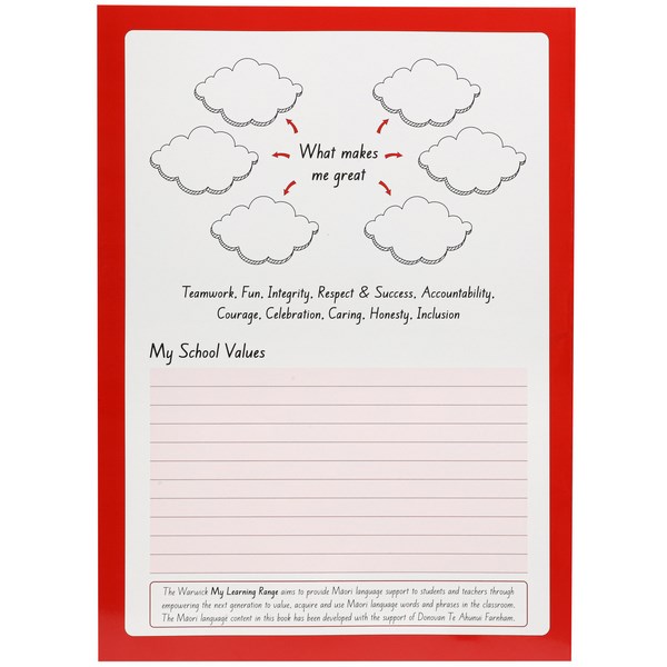 This Warwick My Topic Book 1 Taku Pukapuka Kaupapa is a daily exercise book with unruled pages that is perfect for school use. It features reinforced four-staple binding on the spine for strength and a gloss laminated cover for durability and longer-lasting use. The book contains reference material such as school values activity and bilingual English and Te Reo Maori greetings, farewells, classroom commands, colours, objects, shapes and a map of New Zealand.