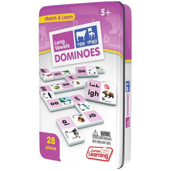 These Junior Learning Long Vowels Dominoes are a fun, interactive way to help children learn about long vowel sounds. The pack of 28 thick plastic dominoes are ideal for small fingers. The Long Vowels matching game is great for use in the classroom and at home. The dominoes come in a convenient tin for easy storage.