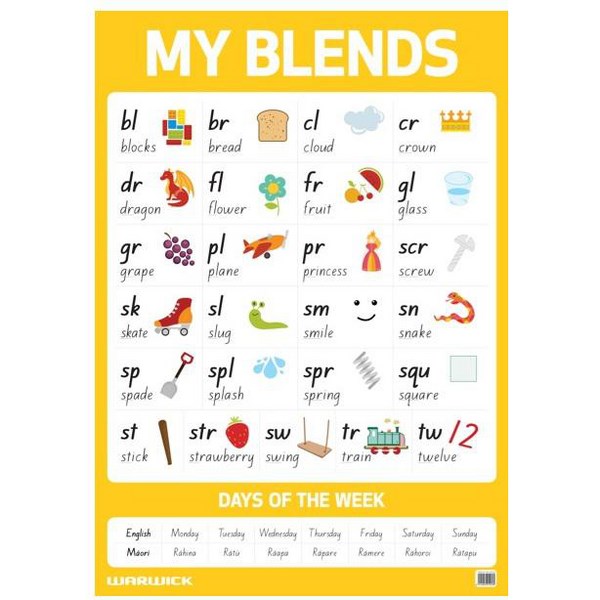 The Warwick My Literacy 2 Wall Chart is a laminated teaching resource for the little ones. It includes reference materials such as days of the week in both English and Maori as well as an illustrated blends chart. The A1 size wall chart measures 594x841mm and is great for use at home or the classroom.