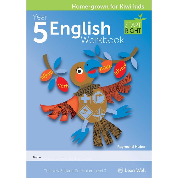 This workbook covers Level Three of The New Zealand Curriculum, English. It will suit 9 year old and 10 year old students. It covers the learning strands 'Listening, Reading and Viewing' and 'Speaking, Writing and Presenting'. There is a section covering word classes, grammar, sentence structure, the dictionary and thesaurus. There are plenty of exercises for students to apply knowledge and practice skills with answers in the back of the book. New Zealand stories and examples are used to illustrate concepts. Footers on each page indicate the Achievement Objective Indicator being covered.