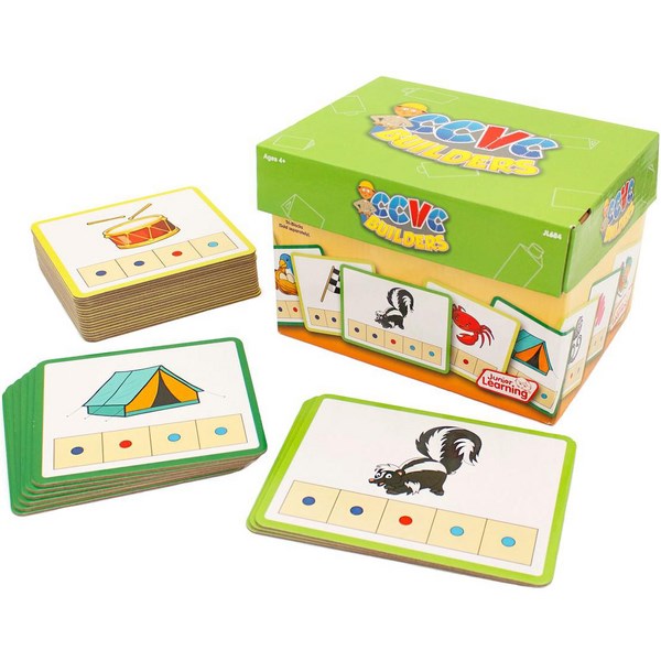 The Junior Learning CCVC Builders set includes 26 cards featuring CCVC (consonant-consonant-vowel-consonant) words, accompanied by picture and colour guides. These cards are designed for use with the CVC or Phonics Tri-Blocks Tub, allowing children to progress as they learn to sound out and build words. Each card has an answer key on the back for self-checking.