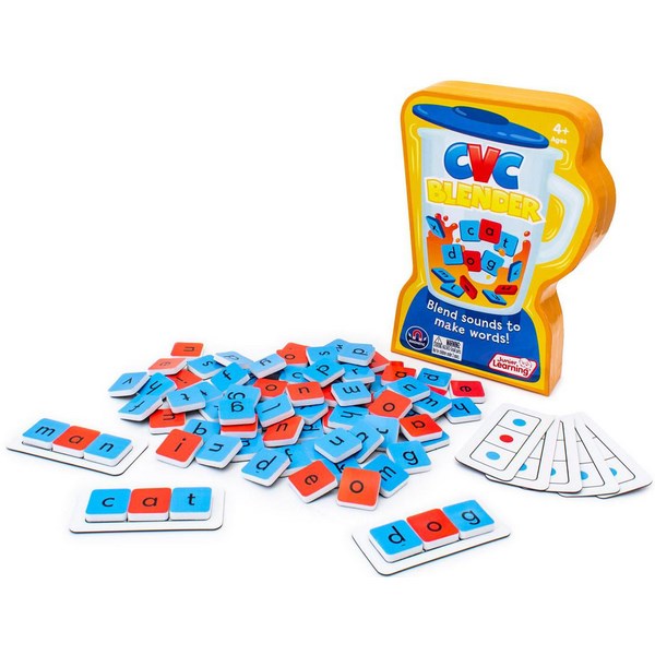 The Junior Learning CVC Blender is an interactive word-building game designed to help children blend sounds and form new words, focusing on common Consonant-Vowel-Consonant (CVC) patterns. The game includes 90 letter tiles and 16 phoneme frames to facilitate the word-building process.