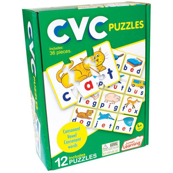 The Junior Learning CVC Puzzles are an excellent resource for teaching children about consonant-vowel-consonant (CVC) patterns. The set includes 36 pieces that can be combined to form 12 complete puzzles. Each puzzle features a CVC word that matches a corresponding picture, helping children to learn and reinforce their understanding of these basic word structures in a fun and engaging way.