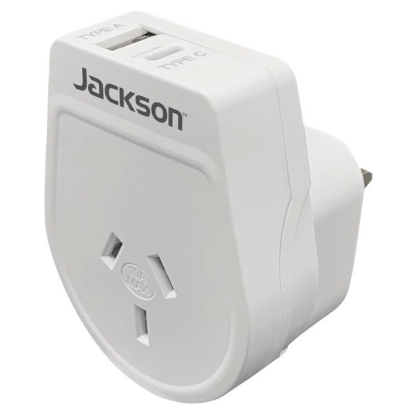 This Jackson Slim Outbound Travel Adapter is a compact and lightweight travel essential that connects plugs from Australian and New Zealand three-pin sockets to UK and Hong Kong sockets. It's a great item to have in your travel bag to stay charged and connected while abroad.