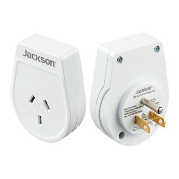 This Jackson Slim Outbound Travel Adapter is a compact and lightweight travel essential that connects plugs from Australian and New Zealand three-pin sockets to USA/Canada sockets. It's a great item to have in your travel bag to stay charged and connected while abroad.
