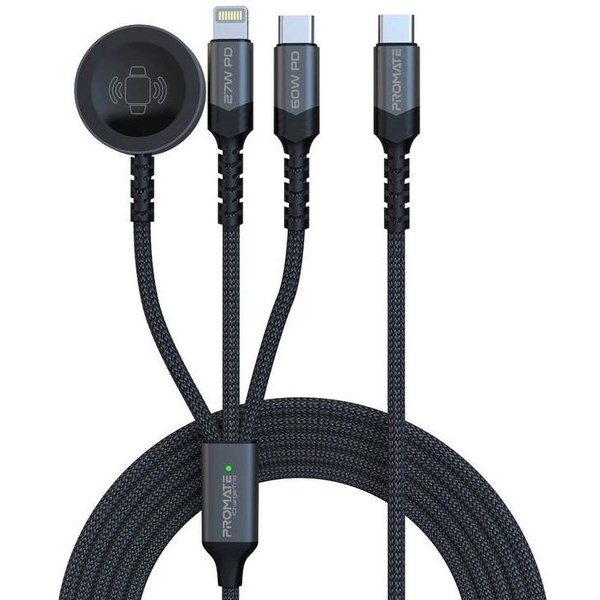 The Promate 5-in-1 Multi Connector Charging Cable is a versatile cable designed for Apple devices and other compatible gadgets. It features a USB-C input and three outputs: a Lightning connector, an Apple Watch charger, and an additional USB-C connector, allowing for simultaneous charging of multiple devices.