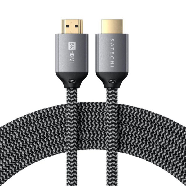 The Satechi Ultra High-Speed HDMI Cable connects laptops, tablets, or streaming devices to Ultra HD setups, supporting video resolutions up to 8K at 60 Hz and 4K at 120 Hz. It is backward compatible and features Enhanced Audio Return Channel (eARC) for advanced, lossless multichannel audio. With a strong braided nylon design and a corrosion-resistant 24K gold-plated connector, it ensures a reliable and uninterrupted viewing experience.