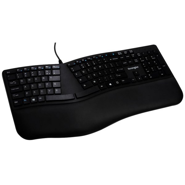 The black split and sloped Kensington Ergo Wired Keyboard has an adjustable reverse tilt and built-in wrist rest, positioning your hands for improved comfort. The plug and play USB connection is simple and reliable, and makes it easy to set up. Quiet keys create smooth, non-disruptive typing, while spill-proof protection from liquids makes clean ups fast and easy. Ideal for use at home or in busy office environments.