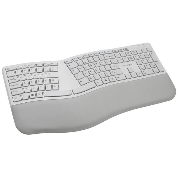 The grey split and sloped Kensington Pro Fit Ergo Dual Wireless Keyboard has an adjustable reverse tilt and built-in wrist rest, positioning your hands for improved comfort. Dual wireless with AES 128-bit encryption delivers the flexibility of 2.4GHz and Bluetooth with high security for your data. Quiet keys create smooth, non-disruptive typing, while spill-proof protection from liquids makes clean ups fast and easy. Ideal for use at home or in busy office environments.