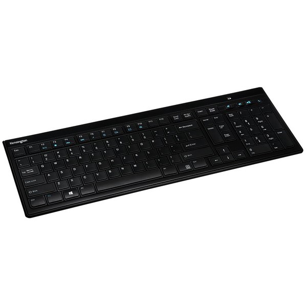The Kensington Slim Type Wireless Keyboard has a sleek and slim design with a full size keypad, perfect for the modern office. Quiet keys are non-disruptive and great for concentration, while their scissor-style provides responsive typing for precise control. This keyboard delivers a stable wireless connection for up to 10m with 128-bit AES encryption to keep your data secure. It features an integrated tilt stand for comfortable typing and a convenient visual confirmation of battery life.