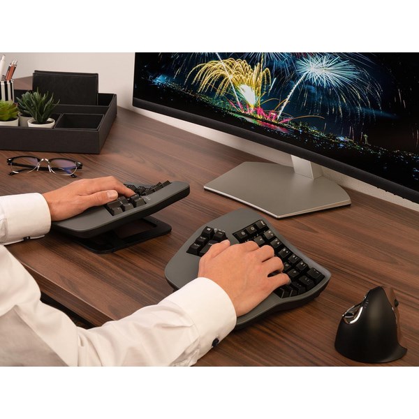 The Kinesis Bluetooth Advantage 360 Keyboard features an ergonomic design to boost comfort and productivity. It connects wirelessly with up to 5 Bluetooth devices. The keyboard does not include cables which allows for greater freedom of movement for users.