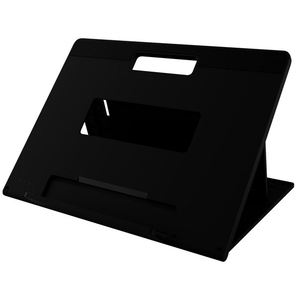 This Kensington Easy Riser Go Laptop Stand lets you lift your screen to a comfortable viewing height. The laptop stand has the additional benefit of providing greater airflow around your laptop or tablet. The sleek, ergonomic laptop stand allows you to adjust the height and the angle of your device to help with comfortable posture and eye alignment while you're working. The laptop stand features padded inserts that help to ensure a secure fit for your laptop or tablet, and the stand has anti-slip foot pads to prevent it from sliding forward.