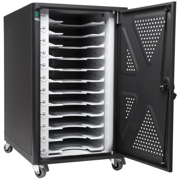 The Kensington AC12 Charging Cabinet provides professional-level storage, power and security for up to 12 mobile devices. Running on AC power, this charging station safely charges 12 devices simultaneously. Its slide-out drawers provide an easier check-in/check-out experience for teachers and administrators. The cabinet features rugged dividers with convenient cable routing to help manage cord clutter, 4 rubber wheels that allows it to spin and roll in any direction, and locking foot pedals on the 2 front wheels to ensure it won't roll out of position.