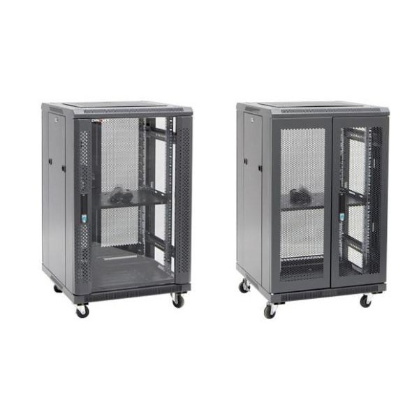 The Dynamix Server Cabinet is designed to safeguard sensitive electronic networking equipment such as servers and telecommunications gear. It is constructed from robust heavy-gauge steel, ensuring durability and mobility. The cabinet features a tempered tinted glass front door, allowing for easy monitoring of equipment displays, while the dual rear mesh doors promote optimal air circulation and ventilation. Additionally, its fully adjustable mounting rails with square mounting holes accommodate a variety of rack-mounted equipment depths.