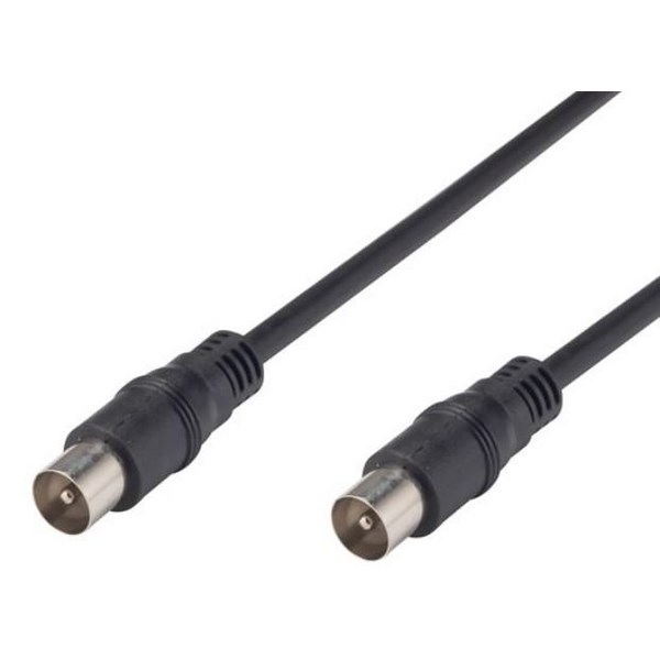 The Dynamix RF Pal Coaxial Cable features a male connector on both ends, making it suitable for connecting a TV antenna or wall plate to a TV or another wall plate. This cable ensures a dependable connection, allowing for clear signal transmission between RF devices.