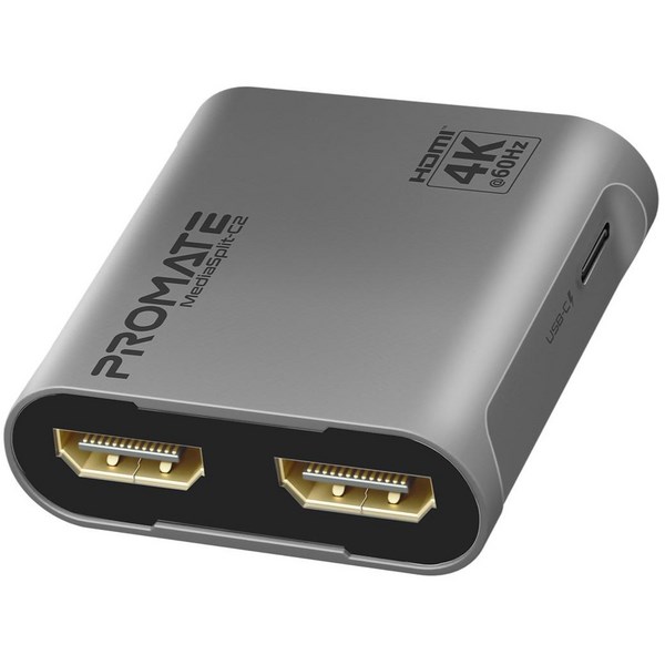 The Promate HDMI Splitter comes with two HDMI ports, enabling users to transmit audio and video signals from a single HDMI source to two TVs or monitors simultaneously. It supports various resolutions, including up to 4K at 60Hz, ensuring high-quality and vibrant video without lag or signal drop-off. Additionally, it is compatible with all devices that provide video or audio output and features a convenient plug-and-play design for easy setup.