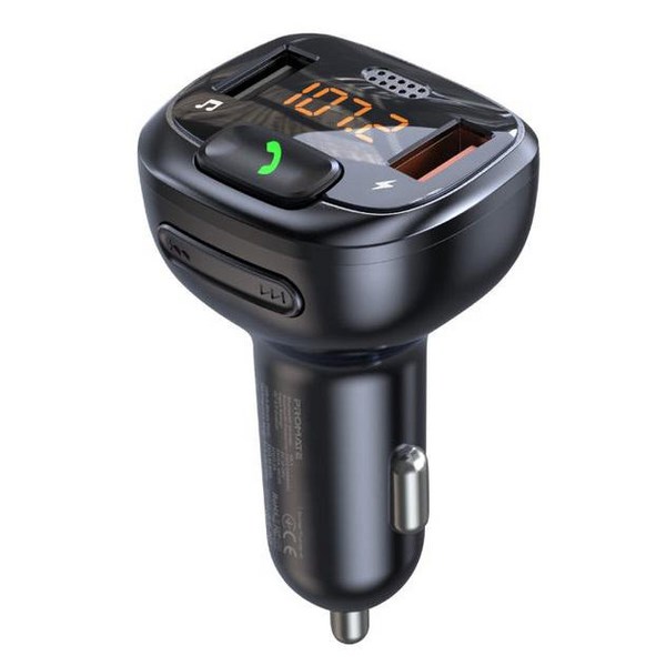 Take your calls and music with you on your drive thanks to this Promate Wireless In-Car FM Transmitter. It streams music and calls from your smartphone to your vehicle radio through multiple connectivity options including USB flash drive, microSD Card, and Bluetooth. There is a built-in microphone for hands-free calling to ensure you stay safe on the road. The transmitter has a QC3.0 charging port along with an additional USB charging port making it the perfect companion to have with you in the car.