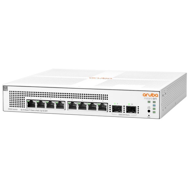 The Aruba Instant On 1930 8G Class4 PoE 2SFP 124W Switch from the 1930 Switch Series is an affordable and easy-to-deploy, smart-managed, fixed-configuration Gigabit switch designed for today’s bandwidth-heavy applications. The cloud-hosted web interface and the Instant On mobile app make it easy to set up the 1930 switch quickly, then monitor and manage it from anywhere at any time. You can also manage it using the local Web UI. Aruba’s future-ready, built-in security features protect your network from unauthorized access, keeping your business data safe. IEEE 802.1X, MAC authentication, VLANs, Network Access Control (ACL), and Port Security allow you to segment traffic, defining and/or restricting access to each area of the network. It also provides a higher number of available SFP and SFP+ ports along with available copper Ethernet ports. Fiber connectivity provides higher uplink bandwidth and expanded options with more PoE across longer distances than copper cabling can support. Save time and money while getting the flexibility you crave with Power over Ethernet (PoE) technology. The 1930 switch series is ready to deploy in 8-, 24-, and 48-port for non-PoE and Class 4 PoE (i.e., PoE+) models. Up to 30W of power per port means you can deploy innovative 802.11ac wireless technology to maximize productivity. Aruba Instant On switches are designed to complement the sleek and clean look of the Instant On access points, while blending discreetly into your environment. The 8-port models, as well as the 24- and 48-port non PoE+ models, are fanless, making them ideal for quiet office deployments. Port mirroring enables traffic on a port or VLAN to be simultaneously sent to a network analyzer for monitoring. You can set the locator LED on a specific switch to either turn on, blink, or turn off to easily locate a switch within a rack of similar switches. When green Ethernet features are enabled, the switch provides an estimated cumulative energy savings. The 1930 switch series segments voice traffic to dedicated voice networks for optimal performance. It automatically recognizes IP phones and prioritizes voice traffic and has advanced features like basic Layer 2 features like VLANs and link aggregation, as well as advanced features such as Layer 3 IPv4 static routing, and ACLs.