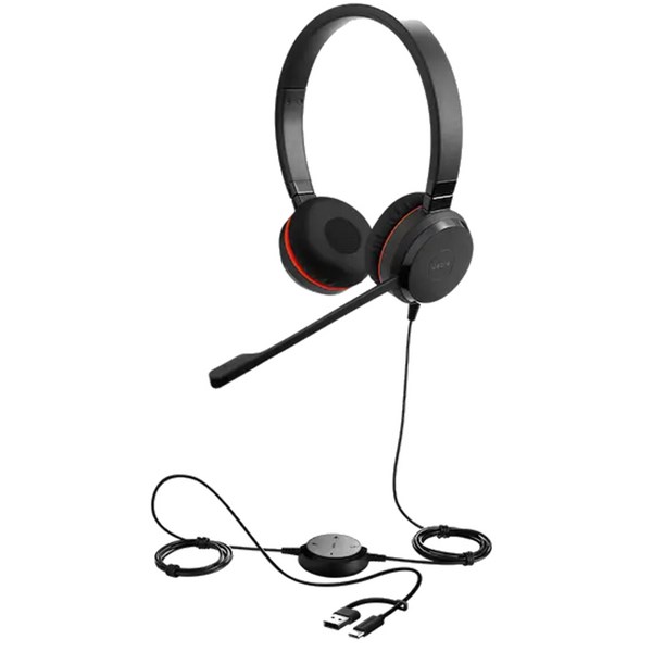 The entry-level Jabra Evolve 20 SE UC Stereo USB-C/A Wired Headset is a great choice whether you are taking calls or enjoying music. It features a noise-cancelling microphone to help reduce background noise and 28mm speakers to deliver immersive audio. With leatherette ear cushions and an on-ear fit for all-day comfort, this wired headset offers dual plug-and-play connectivity via USB-A and USB-C.