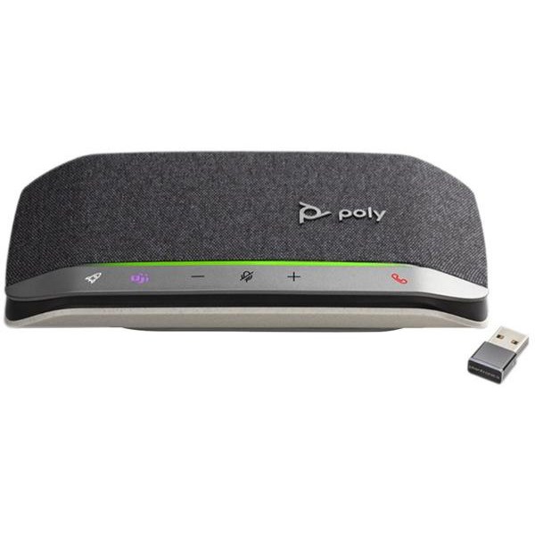 The Poly Sync 20+ CL5400 USB-C Smart Speakerphone is slim and portable, ideal for listening to music and for meetings on the go. For use with PC or smartphone, it features a Microsoft Teams button and comes with a BT600 Bluetooth adapter. It reduces echo and background noise so you can enjoy remarkable sound and professional audio even in busy environments. With up to 20 hours of talk time, this speakerphone lasts all day and includes a USB-A port for smartphone charging so you can stay connected.