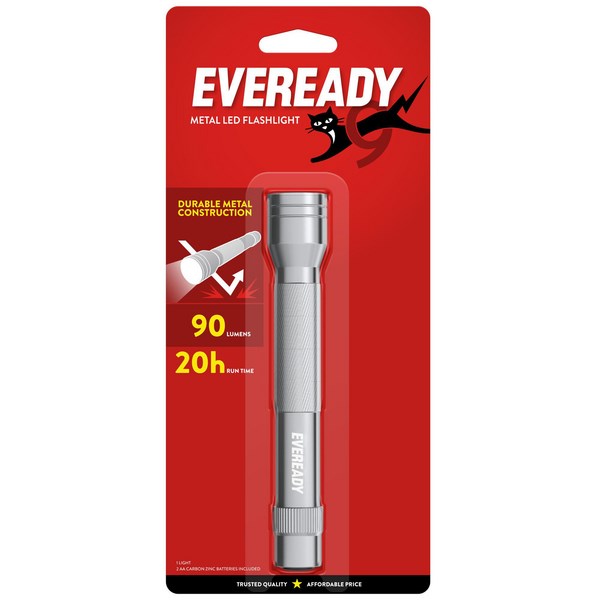 The Eveready 2AA 90L Metal Torch is a reliable and compact flashlight that provides bright LED light for up to 20 hours. Its durable aluminum body resists drops up to 1m and features a textured grip for a secure hold.