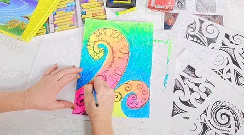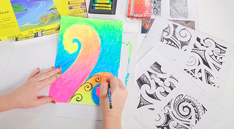 Using oil pastels, colour in your shapes blending colours together. Lighter colours will show off the pencil designs better.