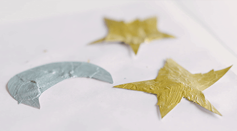 When the glue is set, paint the stars in NZACRYL Metallic Gold, and the moon with NZACRYL Metallic Silver paints. To hang, feed fishing wire through the paper clip and attach to a hanger.